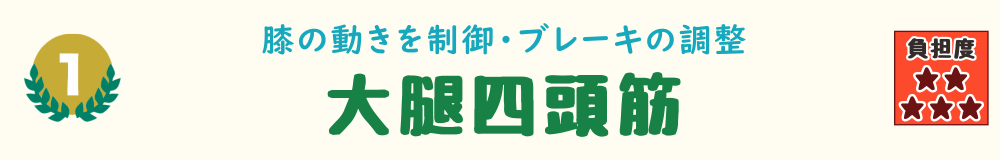 第1位:大腿四頭筋(だいたいしとうきん) ≪負担度:★★★★★≫ 下り階段での筋肉の主な役割: 太ももの前面に鎮座する「大腿四頭筋」は、大腿直筋・内側広筋・外側広筋・中間広筋という4つの筋肉から構成される、大きくて力強い筋肉です。 下り階段では「ブレーキをかけながら、膝をゆっくり曲げる」という“減速の動き(遠心性収縮)”で、常に働き続けているのです。 実は、階段の「上り」よりも「下り」の方が、筋肉の使い方はずっと複雑で、負担も大きいといわれています。 もし最近、下り階段で膝がプルプルするなら…この四人衆、かなりお疲れかもしれません。 ストレッチと筋トレでねぎらってあげましょう! |