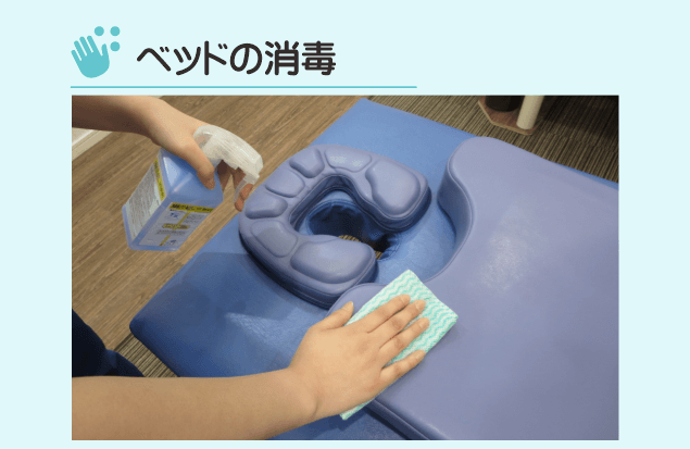 | ベッドや胸マットなどは、1回ごとに消毒液で清拭を行います |