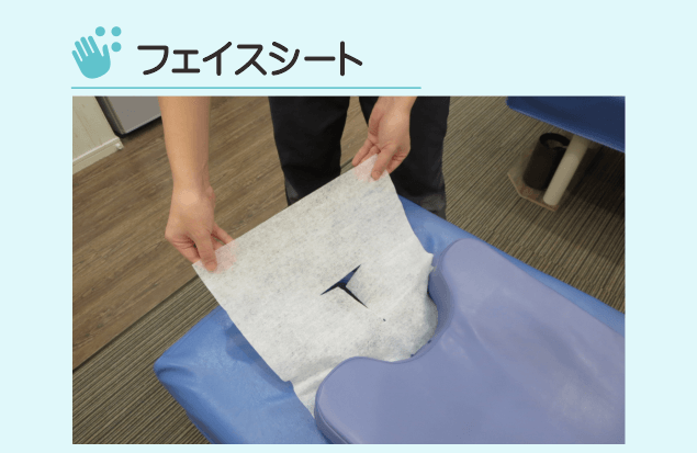 | お顔の当たる部分には、ディスポーザブル(使い捨て)のフェイスシートを使用しています。 |