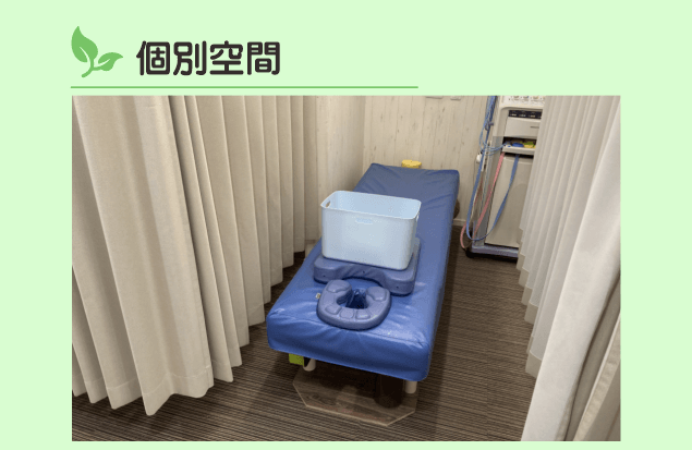 | 各ベッドは「カーテン」で仕切られていますので、隣の方の視線が気になることはありません。 施術を受ける際に、ジャージや短パンに着替えたい方などは、カーテン内でお着替えいただけます。 |