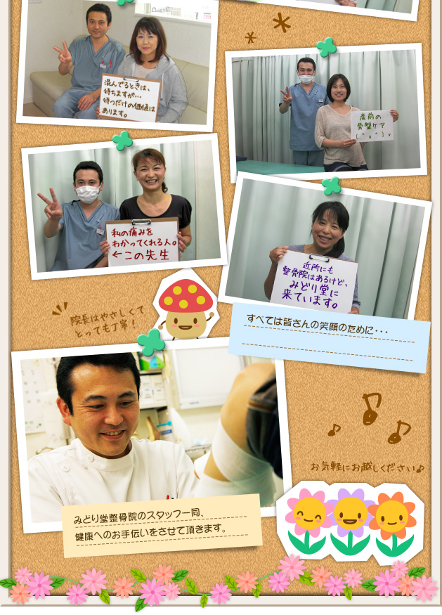 八王子・みどり堂整骨院の日常の様子を、写真で紹介します。 院内の明るく、和やかな雰囲気が少しでも感じ取っていただけたらと思います。 スタッフ一同、力を合わせて・・・ 本日のスタッフたちの写真で…