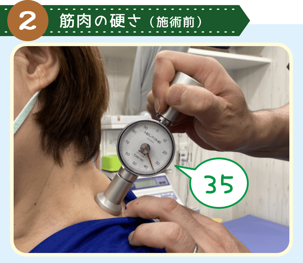 | 【筋硬度の測定】 今回のスタッフチャレンジでは、筋硬度計でリンパ調整の前・後の筋肉の硬さを測定して「リンパ調整で、筋肉は本当に柔らかくなるのか?」も実験・検証したいと思います 左肩の筋硬度は「35」でした。 ※通常の施術の際には、筋肉の硬さの計測は行いません。 |