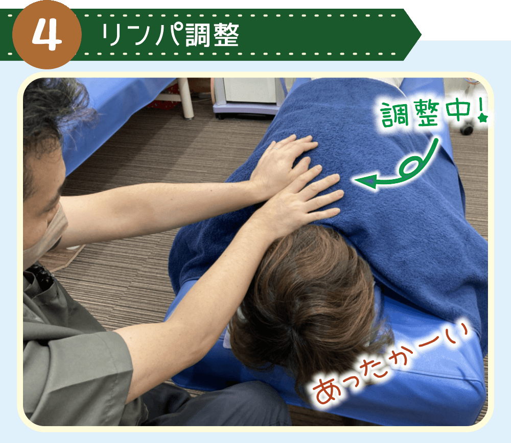 | 今回ご紹介した「リンパ調整」は当院の通常施術の中で受けることができます。 リンパ調整をご希望の方は、スタッフにお気軽にご相談ください。※リンパの調整を行っても追加料金はありません。ご安心ください。 |