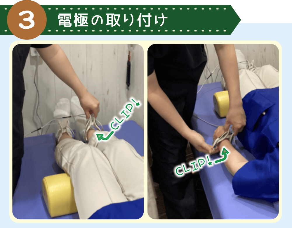 | 微弱電流を開始。 全身に微弱電流を通電します。 通電している電気のモードによって、機器からは「ピコピコ・・・」「カタカタ・・・」といろいろな音がしますが、気にしなくて大丈夫です。 |